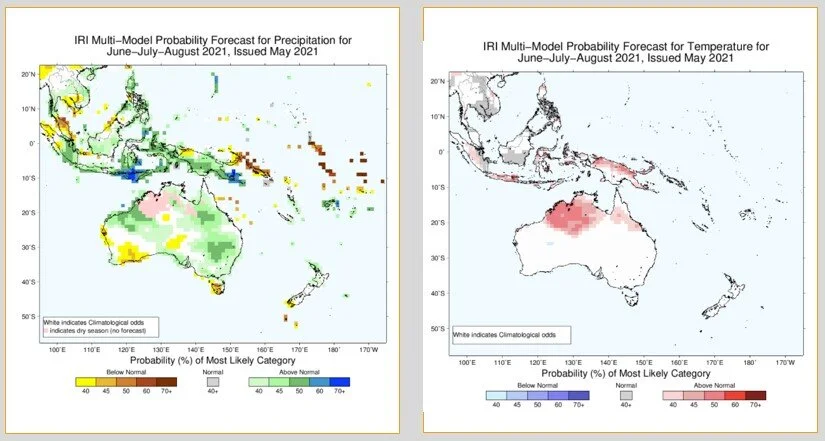 /A survey of 12 international models condensed in the below charts (top both and bottom LHS) shows the outlook for winter rain sitting in the mid-tercile range for the BOM and other EU multi-system, whereas the IRI North American ensemble is more bullish on higher precipitation. Temperature predictions (bottom RHS) show a similar theme with no signal for cooler or warmer conditions. This is not unusual given most indicators are quite close to neutral. The longer-range charts do favour a wet Indian Ocean Dipole developing along with a wet Modoki phase, influencing our spring. SST predictions also favour warm waters through the Arafura Sea and Ningaloo Reef which could well be flowing through model outputs for the mid-latitudes.